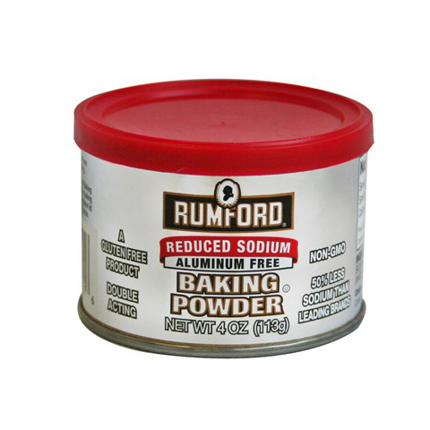 4 oz Rumford Reduced Sodium Baking Powder cans. Rumford Non-GMO, Gluten-Free, Aluminum Free, Double Acting Baking Powder is a great leavening agent used in all types of delicious baked good recipes.