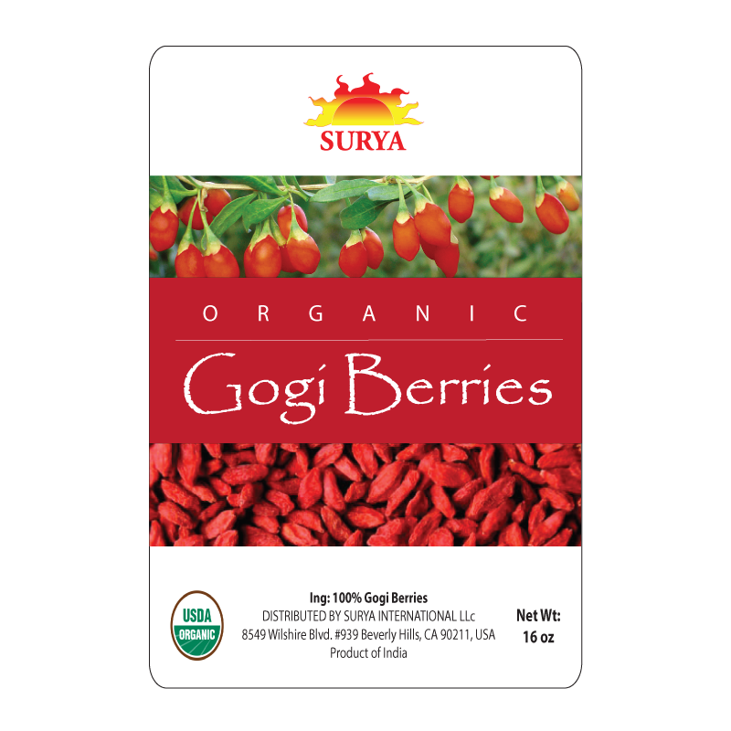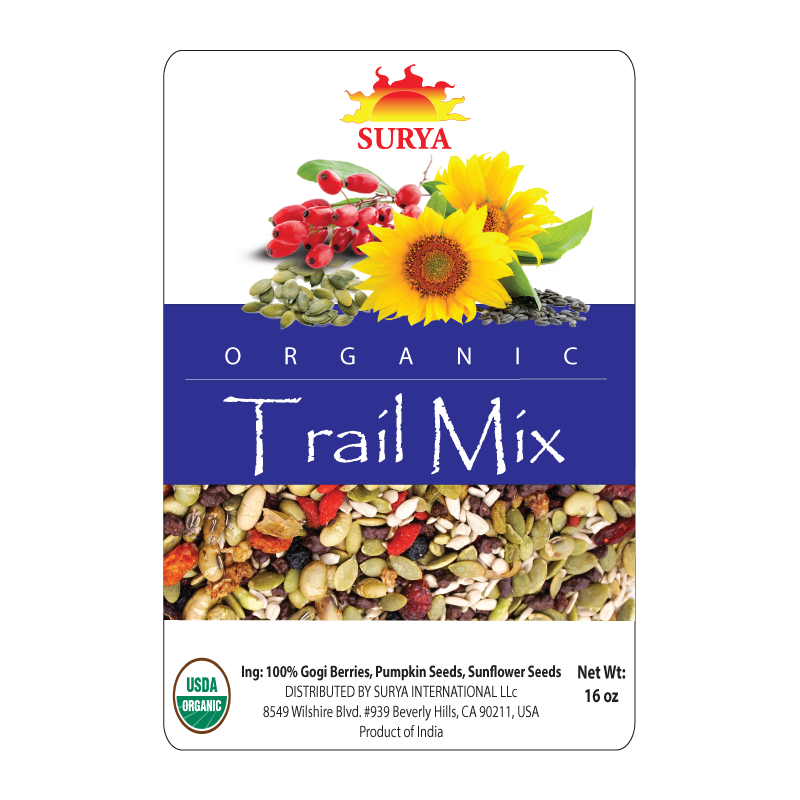 Surya's mix includes organic sprouted pumpkin seeds, organic wild goji berries and organic sunflower seeds.